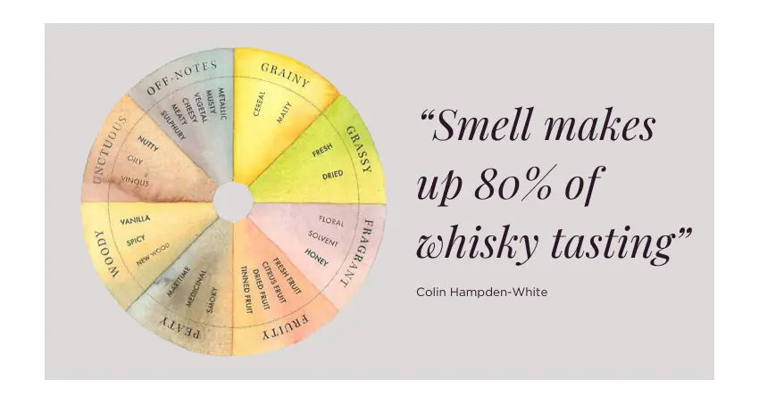 Smell makes up 80% of whisky tasting. Our tastebuds only have 5 main taste sensations. Sweet, sour, salty, bitter and umami, whilst some research has indicated that humans can discriminate more than 1 trillion scents. Therefore, the smell of a whisky is incredibly important and gives us an introduction to what it will taste like.