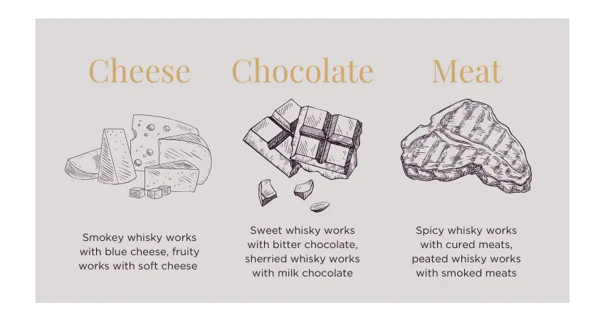 Although whisky is a strong alcohol, there are many foods which can complement whisky or even be a contrast which bring out flavours in both whisky and the food. As well has complimentary or contrasting flavours, texture can also be important to give an enhanced eating and drinking experience.