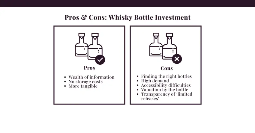 Investing in bottles can be a good option for some. However, bottled whisky holds value in a different way to cask whisky; once the liquid is bottled, it stops maturing and therefore the value does not increase with time. For a bottle's value to increase, it must have rarity and a demand from collectors and other investors wanting to buy it.