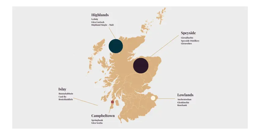 There are five main Scottish whisky regions, each with their differing flavour profiles. These profiles are becoming more blurred as each region creates whiskies of all styles, but traditionally the styles were as such: