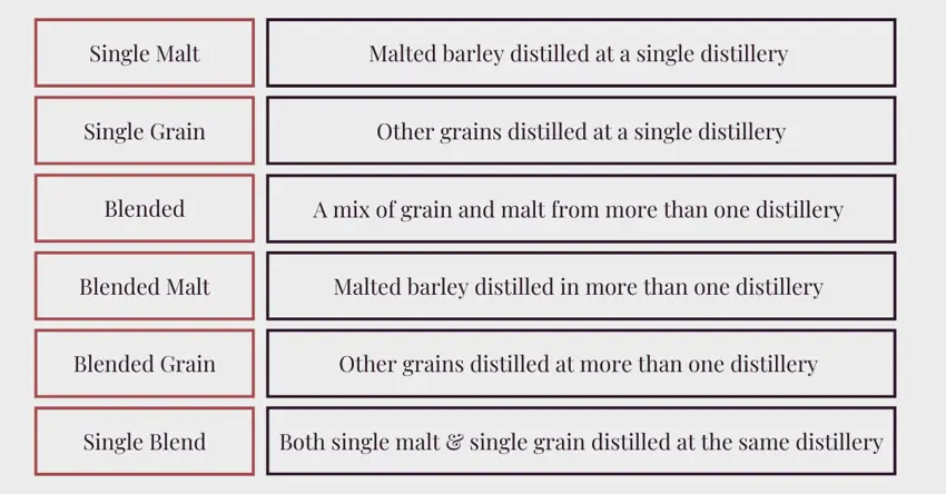 Single blend: Where both the single malt and single grain have been distilled in the same distillery (This is very rare).