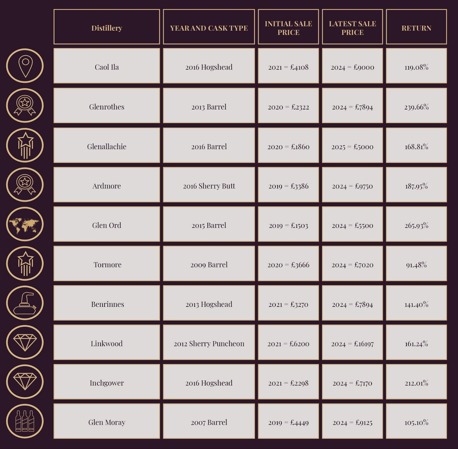 We’ve covered off geography, but what about distillery performance itself? The table below showcases Cask Trade sales data from 2019 - September 2025, giving some fantastic insight into some of the top performing casks recently.